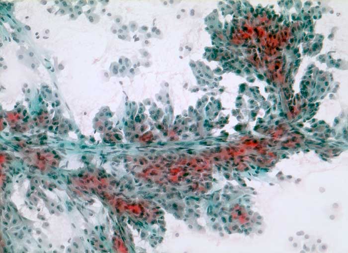 Feinnadelpunktion Schilddrüse: Reichlich onkozytäre Zellen. Diese sitzen in dichten Reihen bindegewebigen Achsen auf. Die Kerne der Zellen sind etwas grösser als regelrechte Thyreozytenkerne und wenig atypisch.