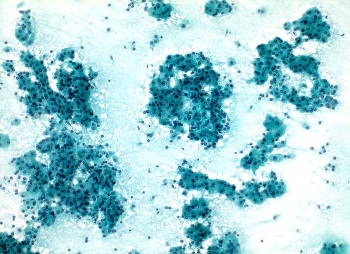 Feinnadelpunktion Schilddrüse: grosse polygonale onkozytäre Epithelverbände mit breitem feingranulärem Zytoplasma und scharfen Zellgrenzen.