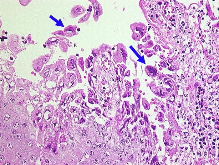 Ulzerierte Zungenschleimhaut. In der unmittelbaren Ulkusumgebungb teils mehrkernige Plattenepithelzellen mit Milchglaskernen.