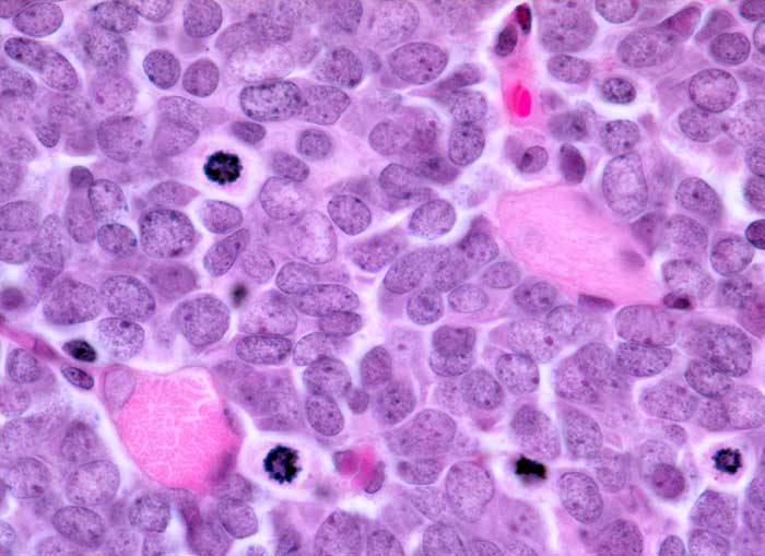 Solides sehr monomorphes Tumorzellinfiltrat. Die Tumorzellen haben praktisch kein Zytoplasma. Das Chromatin ist fein granuliert. Die Kerne enthalten feine Nukleolen. Zahlreiche Mitosen. Der Tumor infiltriert die Skelettmuskulatur.