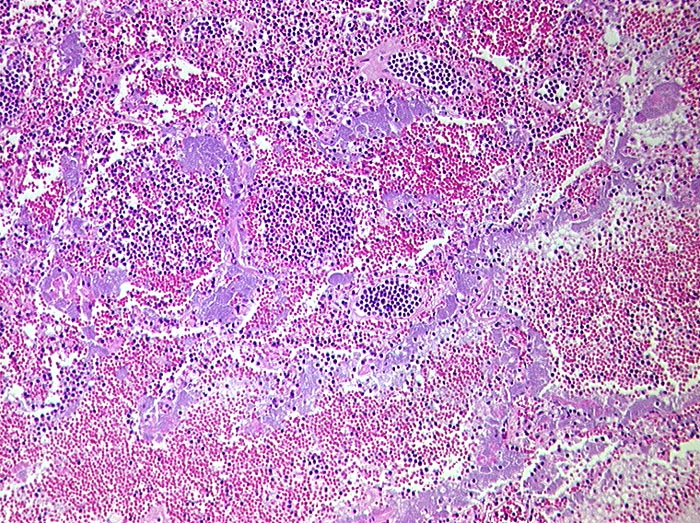 Blaue Bakterienrasen entlang der Alveolarsepten. Intraalveoläre Hämorrhagien. Die kleinen dunklen Zellen entsprechen Lymphominfiltraten. Ein reaktives entzündliches Infiltrat fehlt.