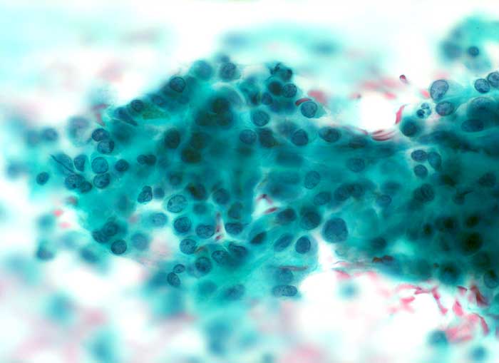 Feinnadelpunktat der Speicheldrüse: Kubische Epithelzellen. Der Kern liegt zentral oder exzentrisch, ist rundlich, fein granuliert und enthält einen zarten Nukleolus. Atypien sind nicht vorhanden.