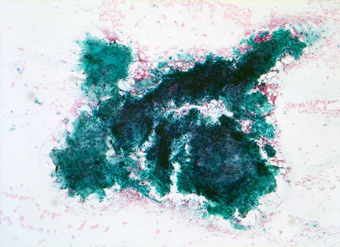 Feinnadelpunktat der Speicheldrüse: Wolkige zyanophile Matrixanteile. Matrix und Epithelien bilden zusammen palmwedelartige Formationen.