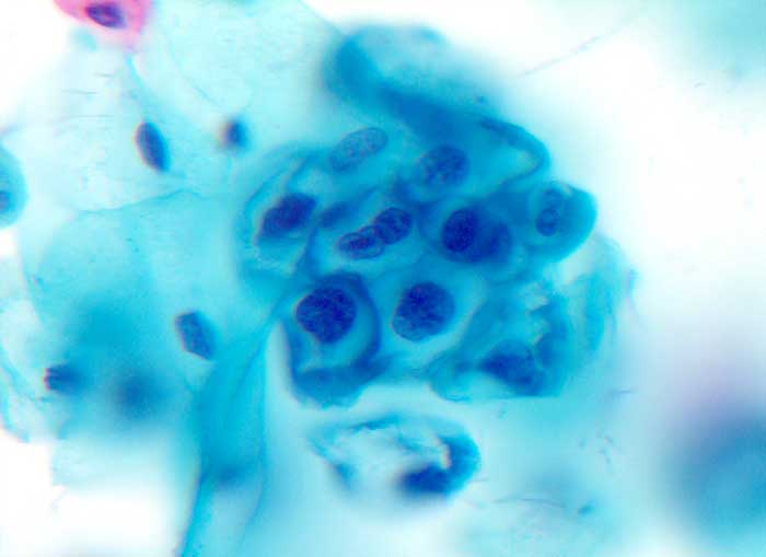 Portioabstrich: Gruppe von Koilozyten: Zellen mit Zytoplasma entsprechend Superfizialzellen. Die Kerne bedecken rund einen Drittel der Fläche einer Intermediärzelle. Hyperchromasie und unregelmässige Kernmembranen. Perinukleärer Halo und peripher verdichteter Zytoplasmasaum. Binukleäre Zellen.