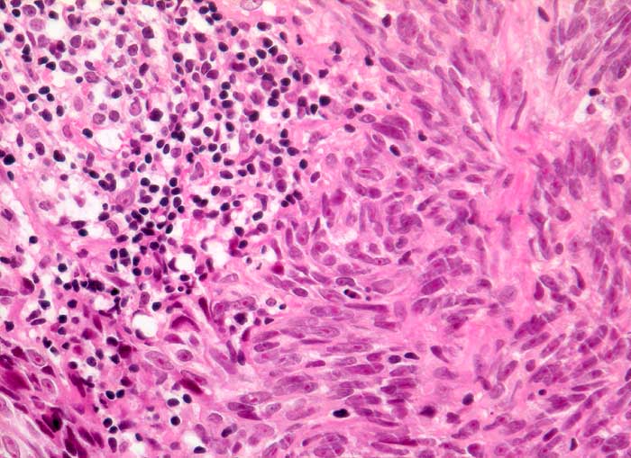 Links im Bild Reste des Lymphknotens. Zu kurzen Faszikeln angeordnete Tumorzellen mit spindeligen Kernen und auffallenden eosinophilen Nukleolen. Kein Pigmentnachweis.