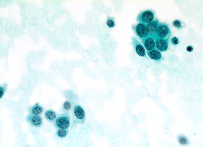 Feinnadelpunktion Mamma: Kleine Zellverbände. Die atypischen Zellen erscheinen monomorph und wenig grösser als normale Mammaepithelien.