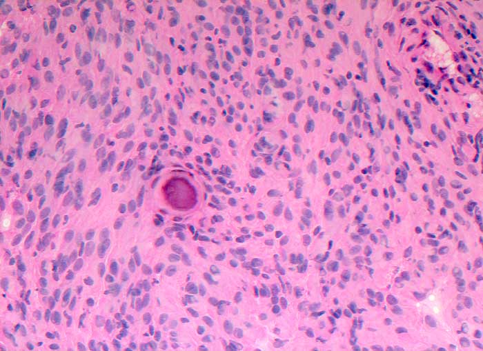 Im Schnellschnitt sind psammomatöse Verkalkungen und meningotheliale Zellen ohne Atypien erkennbar.