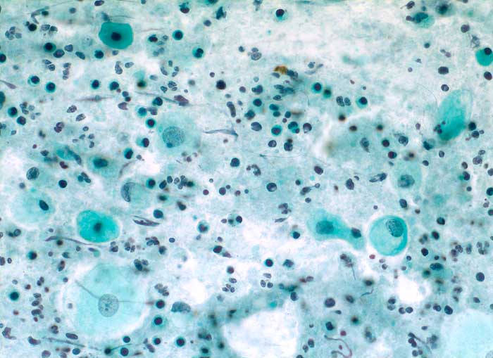 Portio/Zervix Abstrich: Generalisierte Vergrösserung der Zellkerne in atrophen oder parabasalzell-artigen Zellen ohne signifikante Hyperchromasie. Autolyse kann in nackten Kernen resultieren. Degenerierte parabasalzell-artige Zellen mit Kernpyknose. Reichlich Entzündungszellen und basophiler granulärer Hintergrund ähnlich einer Tumordiathese.