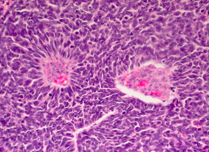 Kleine dichtgepackte Tumorzellen mit eckigen hyperchromatischen Kernen und spärlich Zytoplasma. Pseudorosettenbildung um Gefässe.