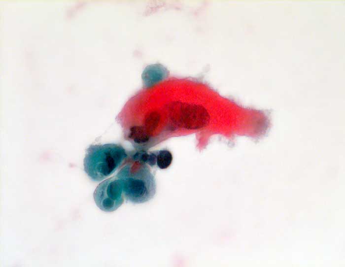bilden einen kleinen Zellhaufen. Eine Zelle weist eine geschwänzte Form mit intensiv orangeophilem Zytoplasma als Zeichen der Verhornung auf.