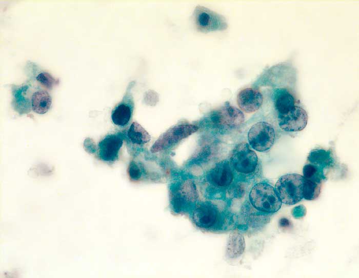 Schnellschnittflüssigkeit Kleinhirn rechts: einzelne und im Verband liegende gut erhaltene atypische Zellen. Die Kerne dieser Zellen sind unterschiedlich gross, überwiegend rundlich vesikulär. Das Chromatin ist grob gekörnt und pro Kern sind meist mehrere plumpe Nukleolen erkennbar. Das Zytoplasma ist teilweise vakuolär.