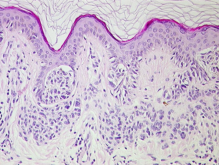 Nester von Naevuszellen in der basalen Epidermis und in der angrenzenden Dermis.