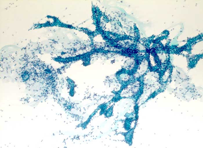 Feinnadelpunktion Mamma: Grosse netzartig verzweigte Verbände aus dicht gelagerten, ziemlich monomorphen Zellen. Zwischen den Zellen amorphe mukoide Matrix.