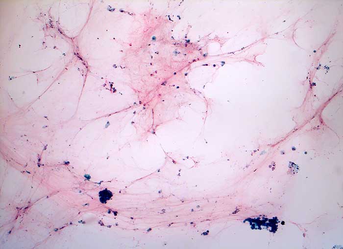 Zytologische Diagnose: Zellen eines muzinösen Karzinoms (Gallertkarzinom).