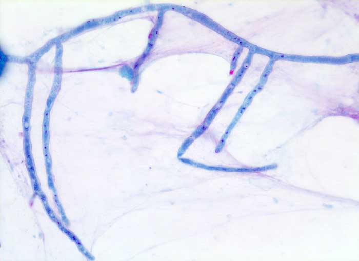 Broncho-alveoläre Lavage: Die Pilzhyphen zeigen Verzweigungen in einem Winkel von 45°.