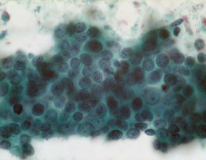 Feinnadelpunktion Mamma: atypische Zellen mit unterschiedlich grossen grob strukturierten Kernen und einzelnen Mitosen.