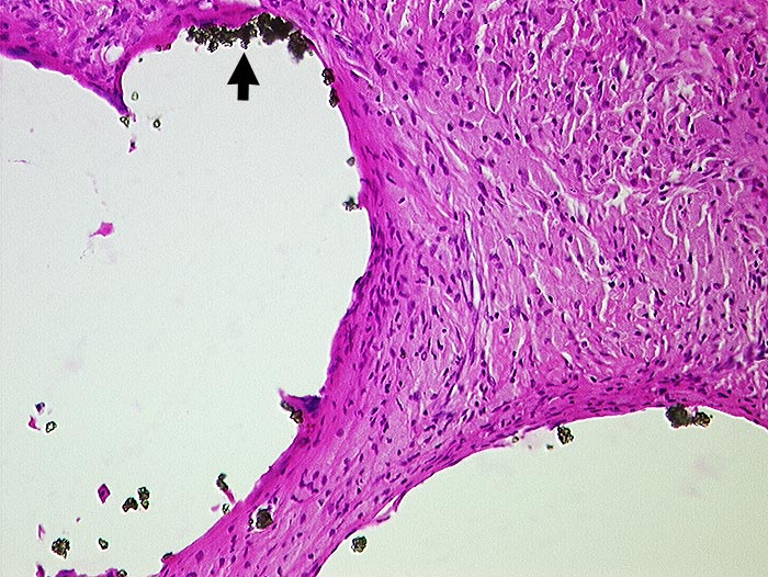 Vernarbtes geringgradig entzündlich infiltriertes Gewebe aus dem Pfannengrund. In grossen Hohlräumen liegen ► Bariumpartikel. Der Zement ist durch die Verarbeitung herausgelöst worden.