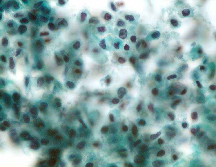 Feinnadelpunktion Mamma: Diffuser Rasen zylindrischer oder polygonaler Zellen mit leicht vergrösserten, teilweise auch etwas unregelmässig konfigurierten und hyperchromatischen Kernen. Daneben auch bipolare Myoepithelien.