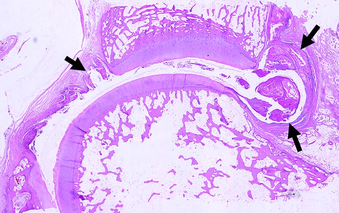 Zehengrundgelenk: Erhaltener Gelenkknorpel. Ablagerungen von