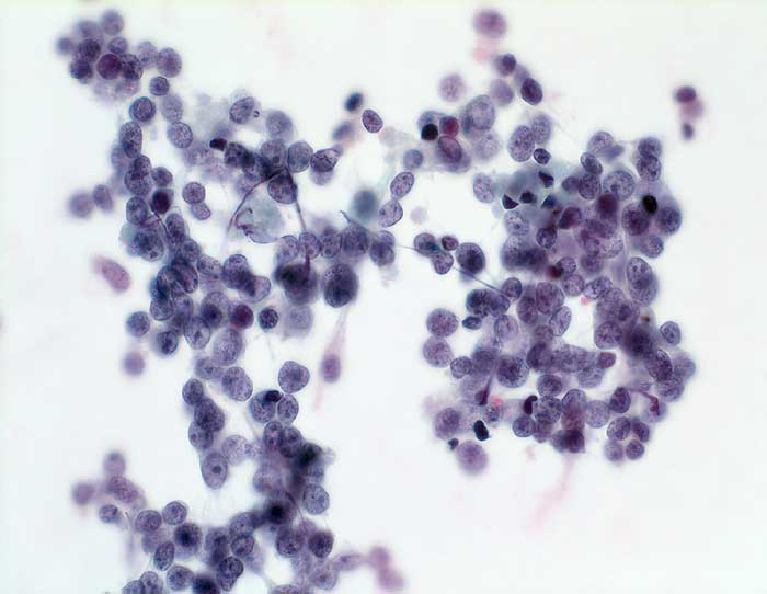 Bronchialsekret: Grosse, ziemlich gleichförmige Tumorzellkomplexe mit runden hyperchromatischen Kernen. Die Gleichförmigkeit der Tumorzellen ist für ein primäres Bronchuskarzinom ungewöhnlich, passt aber gut zu einem Mammakarzinom.