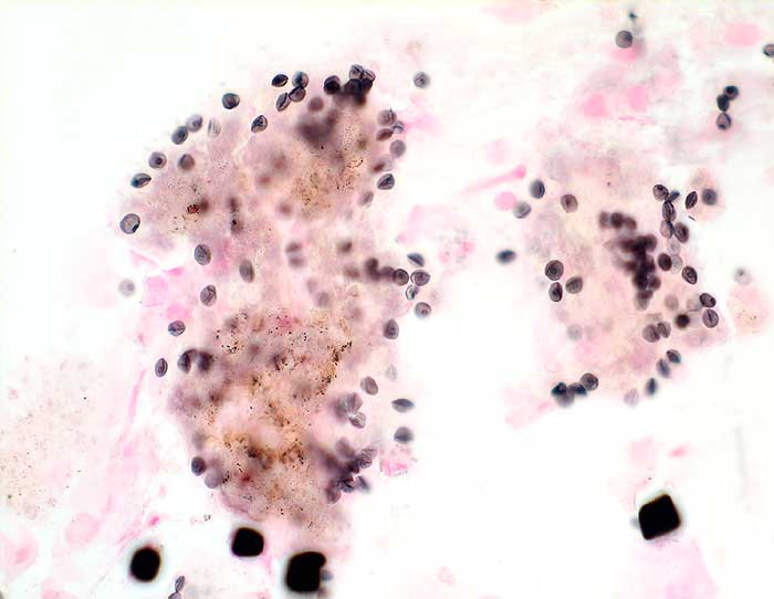 Bronchoalveoläre Lavage: Die etwa erythrozytengrossen Pneumozysten liegen zusammengeballt in einem wolkigen Material.