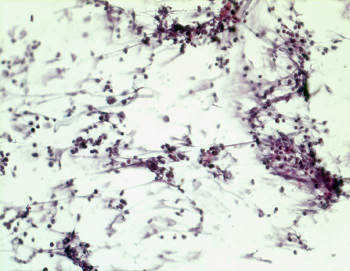 zeilenförmigen Verbänden liegende nacktkernige Tumorzellen mit fragilen Kernen