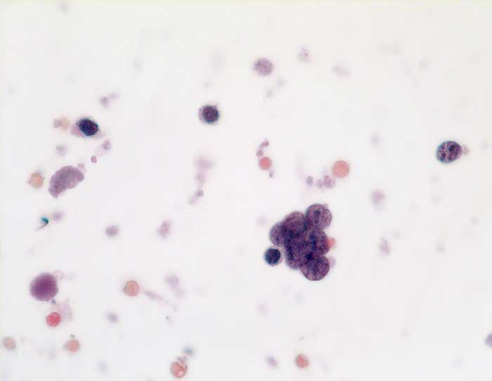 Feinnadelbiopsie paratracheal rechts: Kompakter Verband nacktkerniger Tumorzellen, die etwa dreimal grösser sind als Lymphozyten. In den Verbänden schmiegen sich die Zellen dicht aneinander. Die Kerne sind hyperchromatisch. Nukleolen sind nur andeutungsweise erkennbar. Das Kernchromatin ist relativ fein dispers. Im Hintergrund feinscholliger Detritus.