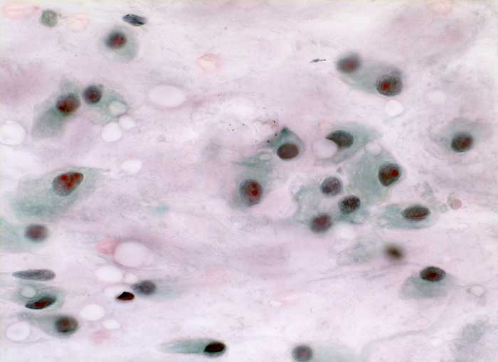 manchmal einem oder auch mehreren leuchtend eosinophilen und ziemlich plumpen Nukleolen. Die Kerne liegen exzentrisch im Zytoplasma. Das Zytoplasma ist hin und wieder feinvakuolär und zyanophil, manchmal auch angedeutet geschwänzt. Ausserdem sieht man eine bipolare Zelle, die einem Fibroblasten ähnelt.