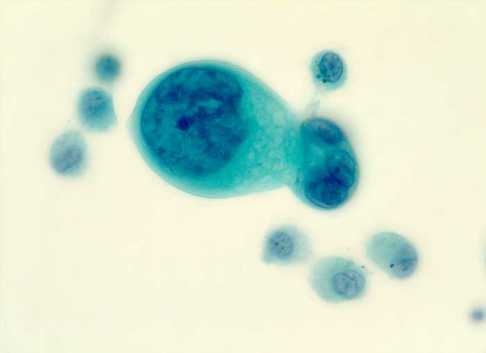 Atypische Zelle mit grob strukturiertem hyperchromatischem Kern und grossem Nukleolus. Daneben eine mehrkernige Zelle.
