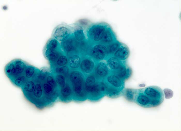 Kleiner Verband atypischer Zellen mit tief basophilen entrundeten Kernen. Die Kerne sind polymorph, grob strukturiert und hyperchromatisch. Sie lassen hin und wieder einen Nukleolus erkennen.