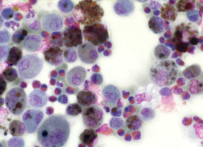 Hämosiderin speichernde Makrophagen als Zeichen abgelaufener alveolärer Blutungen und zahlreiche eosinophile Granulozyten mit rot granuliertem Zytoplasma.