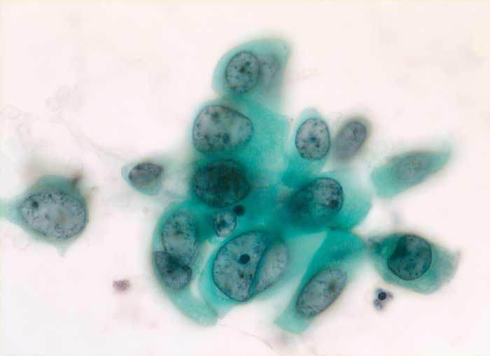Bronchialsekret: Atypische andeutungsweise zylindrische Zellen mit unterschiedlich grossen, zum Teil entrundeten Kernen. Das Chromatin der Kerne ist deutlich vergröbert. Meist sind eines oder mehrere Chromozentren zu erkennen. Der Zytoplasmaleib ist unterschiedlich gross und zyanophil bis fein granulär.