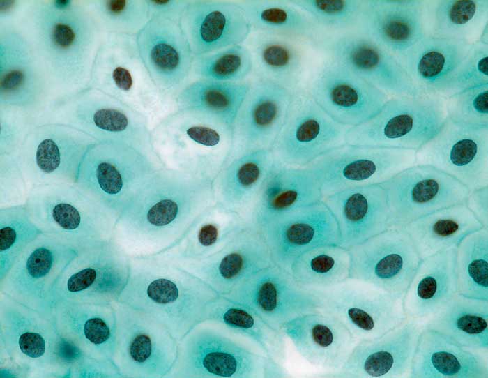 Aspirat aus dem Douglasraum: Häutchenartiger Verband von Mesothelzellen mit gleichförmigen Kernen, die in regelmässigen Abständen gelagert sind. Die Zellen sind wabenförmig angeordnet, die Zytoplasmagrenzen wie bei Pflanzenzellen scharf ausgezogen.
