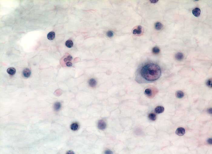 Feinnadelpunktion Lymphknoten supraclaviculär links: Neben Lymphozyten und eosinophilen Granulozyten einzeln liegende grosse einkernige Hodgkin Zelle. Der grob strukturierte Kern enthält einen sehr grossen roten Nukleolus.