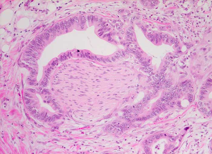 Der Nachweis einer zirkulären Infiltration der Nervenscheiden durch atypische Drüsen bestätigt die Malignität des Tumors und ist vor allem unter Schnellschnittbedingungen ein hilfreiches Merkmal.
