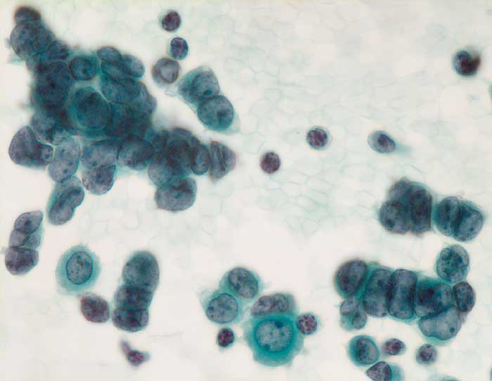 Pleuraerguss: Zeilenförmige Verbände von kleinen atypischen Zellen. Die Zellen besitzen einen schmalen Zytoplasmasaum. Die Kerne zeigen das typische "nuclear molding" (=Aneinanderschmiegen der Kerne) und "Geldrollenbildung".
