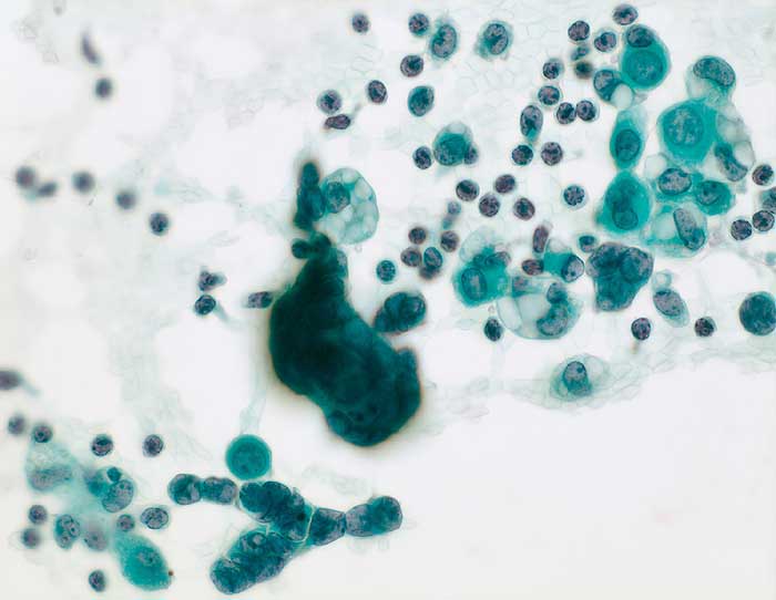 Pleuraerguss: Rechts im Bild Lymphozyten und aktivierte Mesothelien mit vakuolisiertem Zytoplasma. Links unten zeilenförmige Verbände (" Geldrolle") von kleinen atypischen Zellen. Die Zellen besitzen einen schmalen Zytoplasmasaum. In der Bildmitte ein kleiner dreidimensionaler Tumorzellverband.
