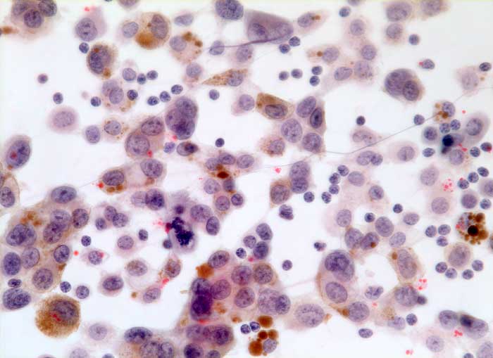 Pleurapunktat: zahlreiche einzeln oder in Pseudoverbänden liegende atypische Zellen mit teilweise grobkörnigem braunem Pigment im Zytoplasma. Die Tumorzellen sind wesentlich grösser als die umligenden Makrophagen, die teilweise ebenfalls Pigment speichern, das sie aus zerfallenen Tumorzellen aufgenommen haben. Die Kerne der Tumorzellen sind rundlich bis oval und zeigen eine Pfeffer- und Salz Struktur. Weiter enthalten die Kerne eines oder mehrere mässig grosse Chromozentren. Einzelne intranukleäre Vakuolen.