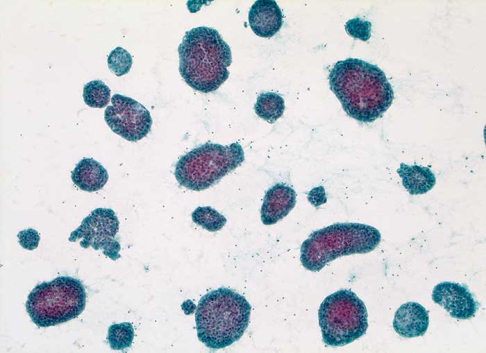 Pleuraerguss: Man erkennt zahlreiche kugelförmige und abgerundete Verbände aus atypischen Epithelien.