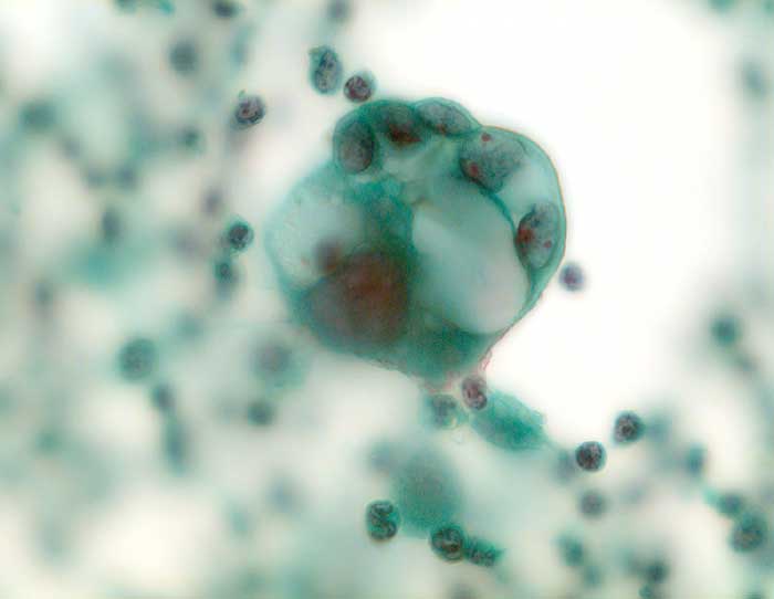 Aszitespunktat: knospenförmiger Verband von atypischen Zellen mit unterschiedlich grossen Kernen und grob vakuolisiertem Zytoplasma.