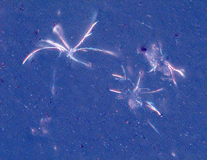 Kniegelenkspunktat, Nativpräparat: Büschel von nadelförmigen Kristallen zu sehen im Nativpräparat (polarisiertes Licht).