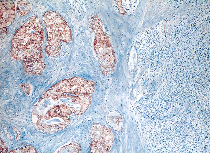 Bei den immunhistochemischen Untersuchungen sind die epithelial differenzierten Tumoranteile positiv für den Epithelmarker Lu-5 und für die prostataspezifischen Marker PSA und PSAP. Die sarkomatös differenzierten Anteile sind dagegen Lu-5 negativ, zeigen aber ganz herdförmig eine schwache, aber eindeutige Positivität für PSAP (prostataspezifische saure Phosphatase). Die sarkomatösen Anteile sind ausserdem stark positiv für Vimentin und S-100. Die S-100-Positivität beweist zusammen mit der herdförmigen Ausbildung von chondroider Matrix und dem ausgedehnt myxoiden Hintergrund eine chondrosarkomatöse Differenzierung. Die myogenen Marker Actin, SMA und Desmin sind dagegen negativ bei positiver interner Kontrolle von glatten Muskelfaserbündeln und Gefässen. Der Proliferationsmarker Ki-67 wird in ca. 90% der sarkomatös differenzierten Tumorzellen, dagegen nur etwa in ca. 5% der epithelial differenzierten Anteile exprimiert.