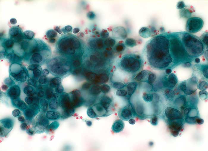 Aszitespunktat: Zahlreiche, teils in kleinen, teils auch in grösseren papilliformen Verbänden liegende hochgradig atypische Karzinomzellen mit ganz unterschiedlich grossen polymorphen, vesikulären und grob strukturierten Kernen und hoher Kernplasmarelation. Nebst einer Population von grossen polymorphen Zellen auch eine Population mit kleineren, weniger atypischen Zellen (sogenannter Dimorphismus). Einige Zellen zeigen grosse zytoplasmatische Vakuolen.