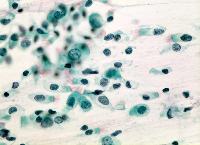 Bürstenbiopsie des Bronchus: zahlreiche Flimmerzellen mit gut erkennbarer