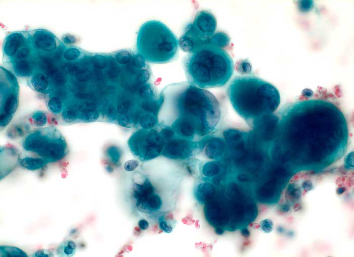 Zytologische Diagnose: Zahlreiche Zellen eines Adenokarzinoms.
