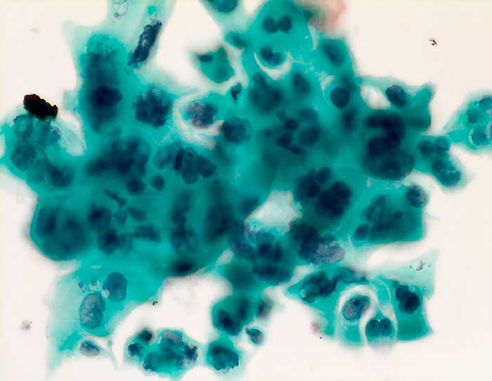Zytologische Diagnose: Epithelien mit Kernatypien. Die vorhandenen Kernatypien lassen sich noch als Reaktion auf die vorausgegangene Strahlentherapie interpretieren (sog. "Strahlenatypie"). Ein Karzinom ist nicht zu beweisen.