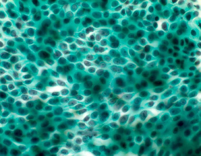 Zytologische Diagnose: Epithelien mit Kernatypien. Die vorhandenen Kernatypien lassen sich noch als Reaktion auf die vorausgegangene Strahlentherapie interpretieren (sog. "Strahlenatypie"). Ein Karzinom ist nicht zu beweisen.