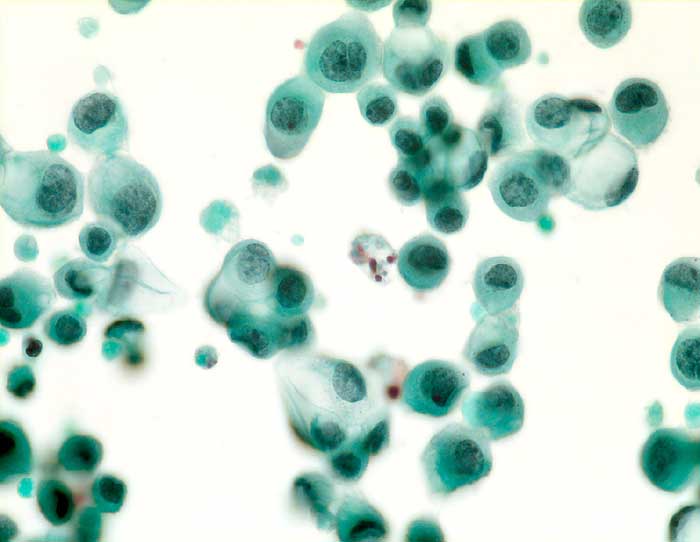 Flüssigkeit aus zystischem Ovarialtumor: zahlreiche kleine Zellverbände mit leichten Kernatypien. Ein Teil der Zellen zeigt vakuolisiertes Zytoplasma. Dadurch werden die Kerne zur Seite gedrängt.