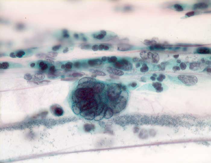 Kleiner Zellverband mit stark überlappenden vesikulären Kernen ohne Atypie.