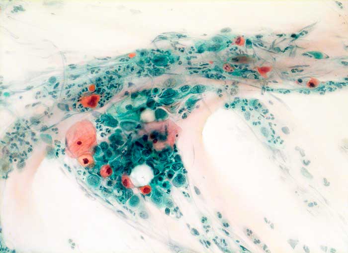 Portioabstrich: einzeln oder in lockeren Verbänden atypische Zellen mit unterschiedlich grossen dunklen Kernen. Deutliche Erhöhung der Kern-Plasma Relation. Als Grössenvergleich dienen eine Superfizialzelle und eine Intermediärzelle. Das Zytoplasma teils zyanophil, teils eosinophil als Zeichen der Verhornung.